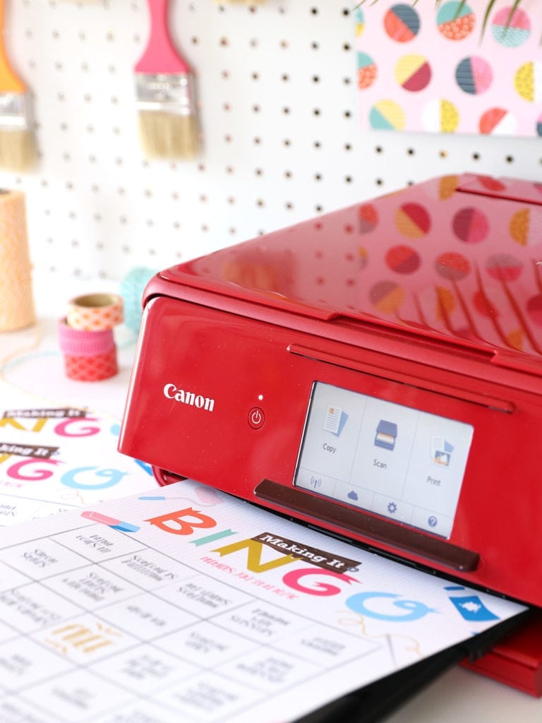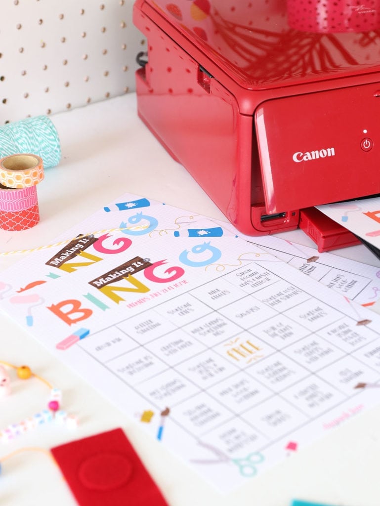 The printable BINGO could NOT be easier. Just grab your Canon PIXMA printer and fire off a bunch of BINGO sheets. We’ve even designed six different variations so you don’t have to worry everyone shouting “BINGO” at the same time. Since the Canon PIXMA does a killer job printing borderless color, we made sure to make this BINGO sheet one of the most colorful you’ve ever seen. OH! And if you need markers for your BINGO game, just pull out some of your crafty stash. Buttons, sequins, felt circles, pom poms, googly eyes – it’s all fair game for this version of BINGO!