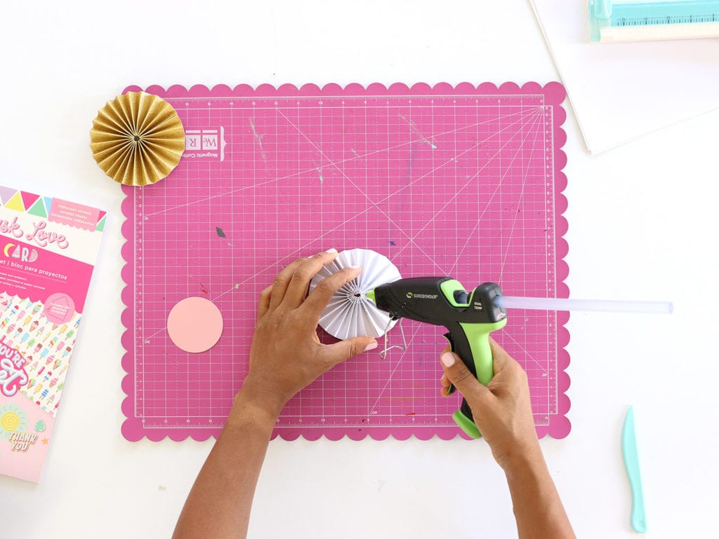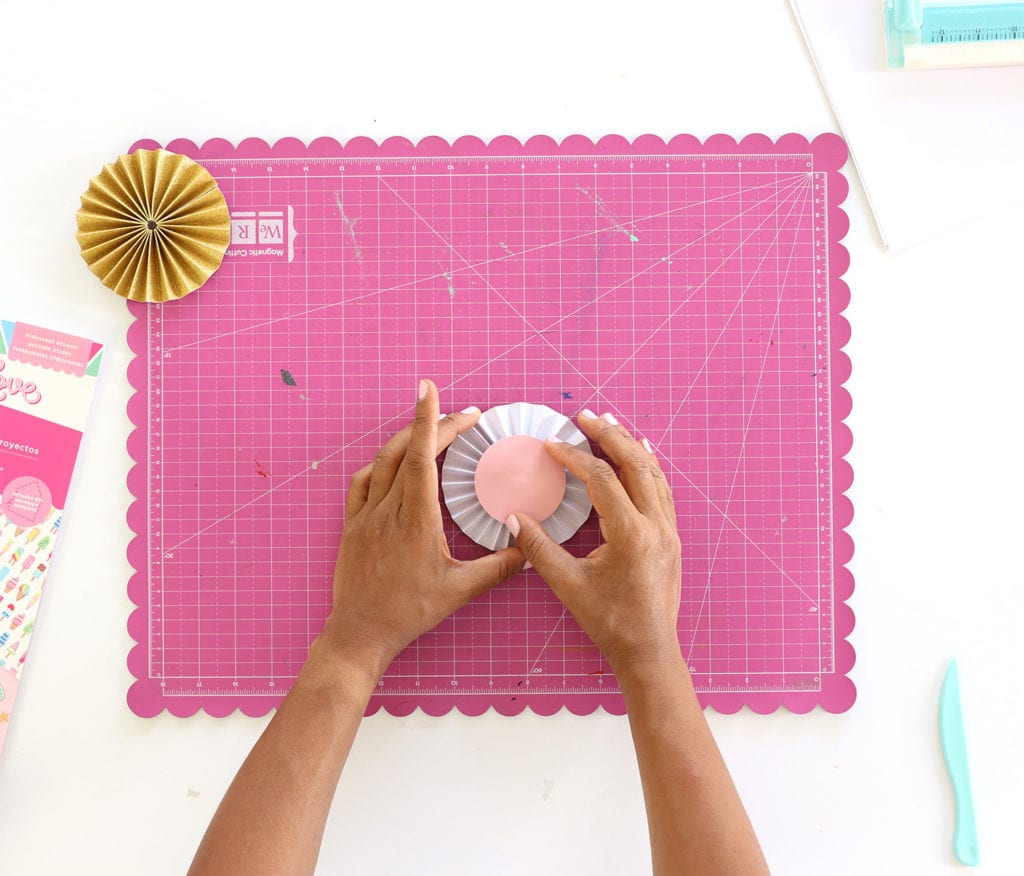 Adhere the strips together then fold like an accordion. Glue the ends together and flatten to create a medallion and add hot glue to the center as shown. Place a plain paper circle into the hot glue on the back of the medallion. This will hold the paper medallion together.
