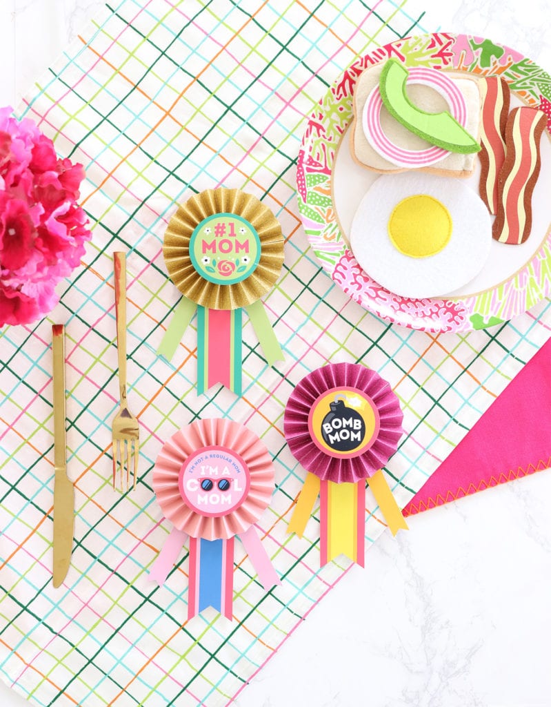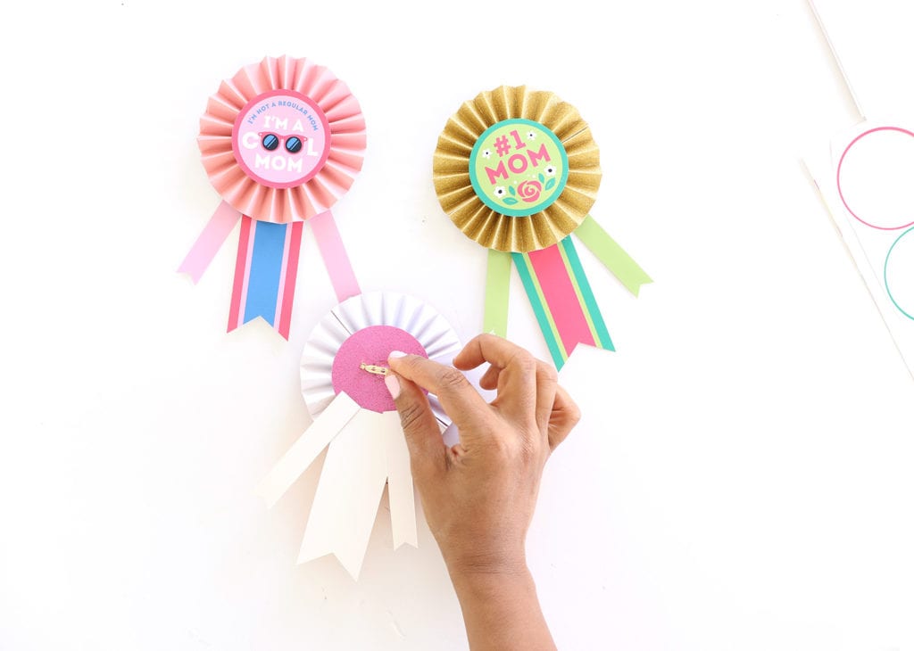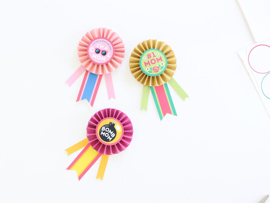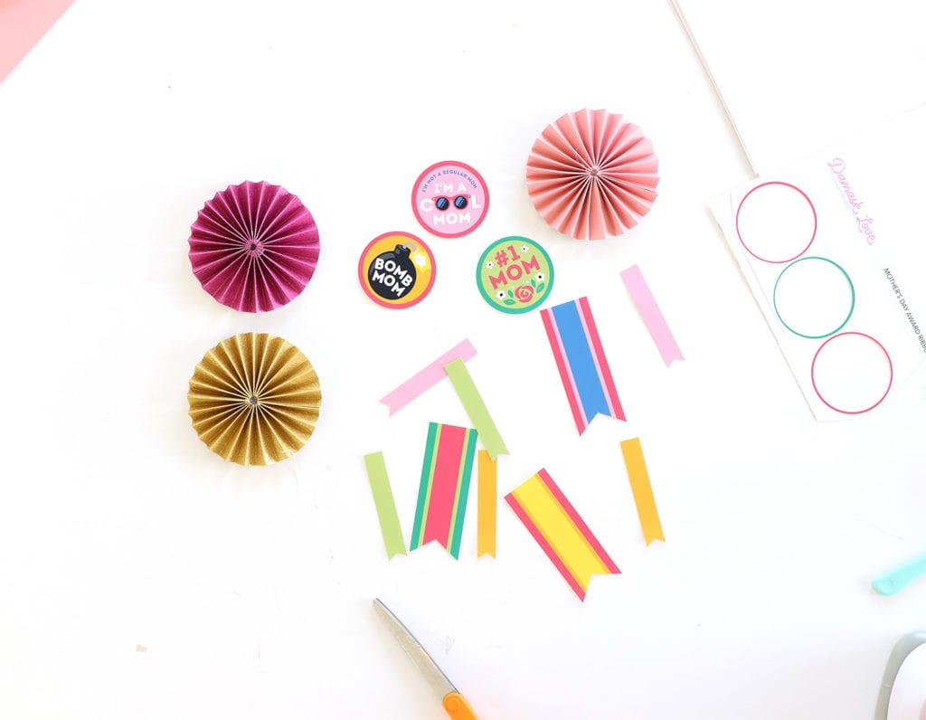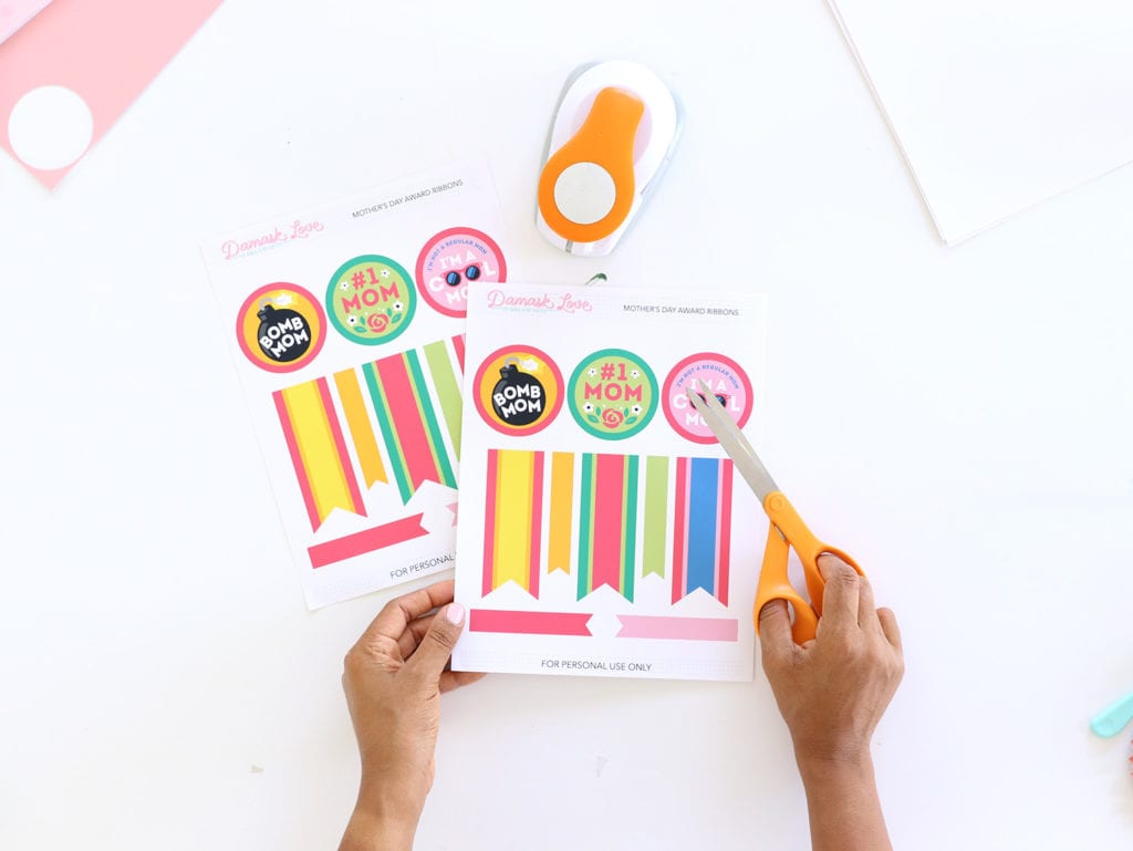 Print out your free Mother’s Day Award Ribbon and use scissors and a 2.5″ circle punch to cut out the badges and ribbon designs.