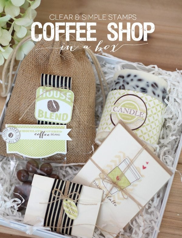 It’s been way to long since I did an “in a box” project – so today I’ve taken all the charm of a coffee shop and assembled it into a gift package that features lots of goodies from Clear & Simple Stamps Collection 7.