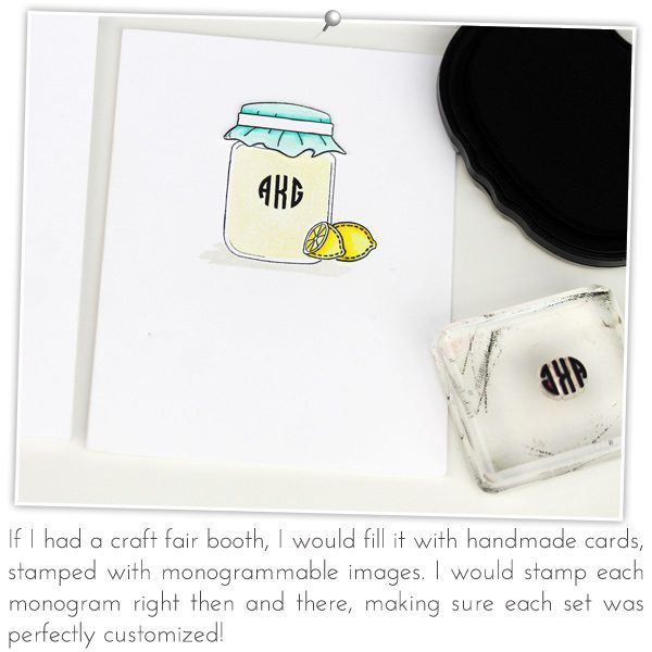 In my craft fair booth, I would sell a selection of monogrammable card sets, that would be personalized right then and there. Each craft fair customer would select her favorite card set, an ink color and would stamp her monogram on to the cards.