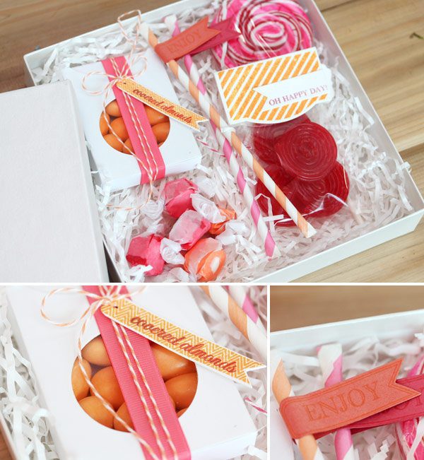 You know those popular candy buffets that are often at weddings and parties? Perfectly color coordinated. Cute packaging. Way too much work to put together. Well, I scaled it down…and put it in a box. All the trappings of a well styled candy buffet…all the cuteness…lots less work.