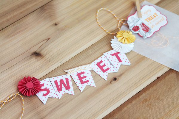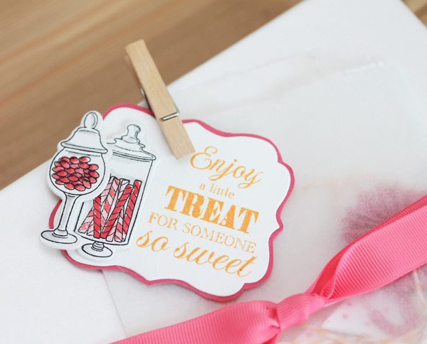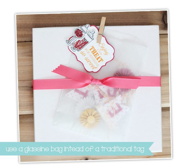 And just like a full-sized candy buffet, my “in-a-box” version has a little paper banner, which I packed up in a simple glassine bag.
