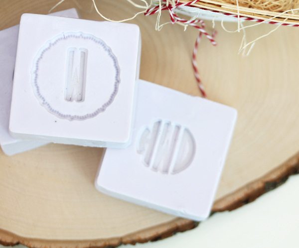 {1} Place monogram into the soap mold. Make sure your stamps are clean! Stained stamps may leave colored impression in your soap.
