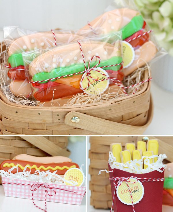 I have no business going near a grill. When I was about thirteen, my friend Olivia and I decided to grill some chicken wings. They were charred and tasted like propane. I haven’t grilled anything since. That’s why you won’t find any grilled food in today’s little party themed post…but you will find cookies. And let me honest…burgers are delicious, but burger shaped sugar cookies are delicious and adorable.