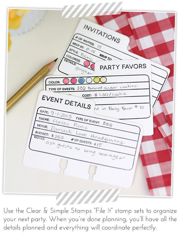 To give you a little inspiration for planning a summer soiree of your own, take a look at the new File It collection available through Clear & Simple Stamps. Each set allows you to organize your creative projects and special events.