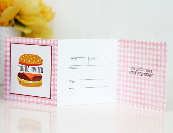 This simple trifold invitation is a slight departure from traditional invites. It measures 3.5″ square and one sheet of 8.5 x 11″ cardstock will yield two invitations. I stamped the invitation with gingham, which is the official pattern of summer, right?
