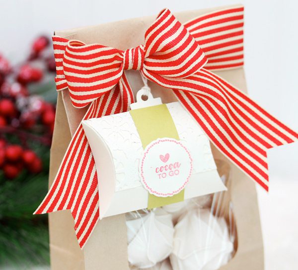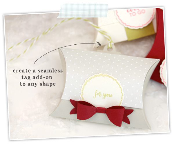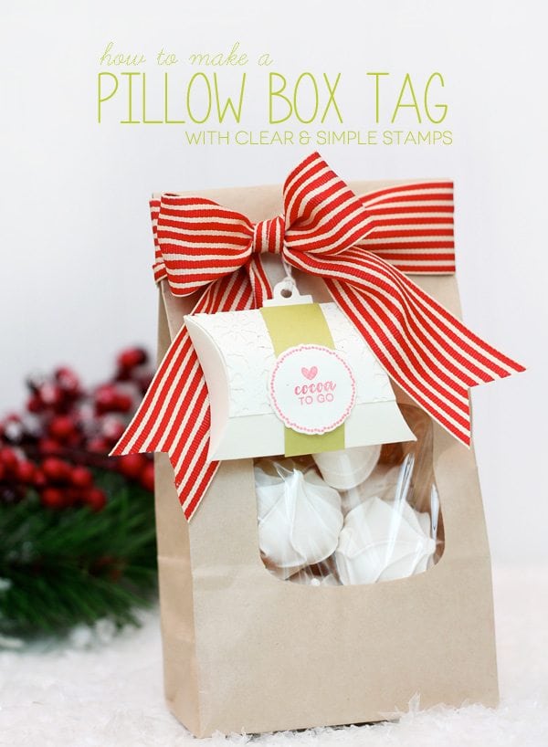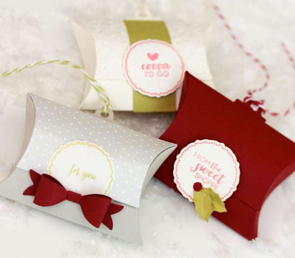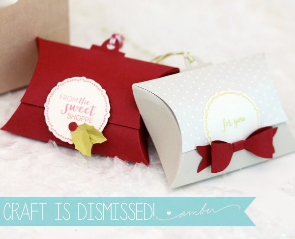 A, love how you added a partial tag to the pillow box….So cool. Love the holly and beautiful red bow embellishments, too!