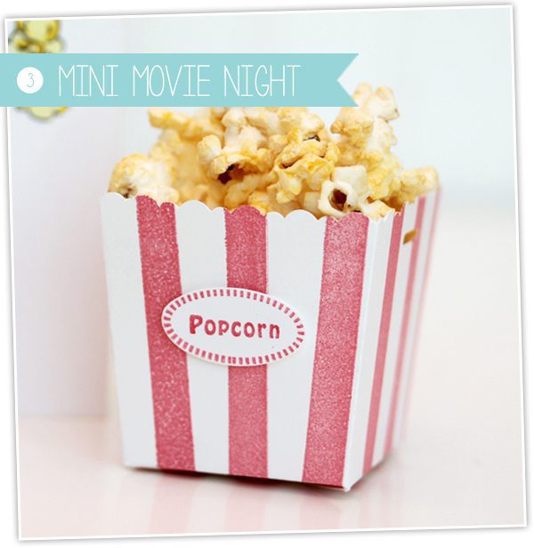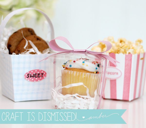 With a pair of scalloped scissors to trim off the top of the favor box and a few red stripes, this favor die quickly becomes a mini popcorn box…the perfect favor for movie night!