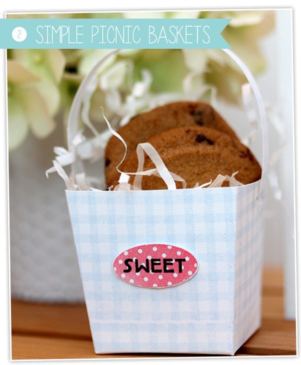 By trimming off the top of your box and adding a strip of paper, this die quickly becomes a cute basket. Here I summoned a little country-themed crafting by stamping a gingham pattern onto the entire box.