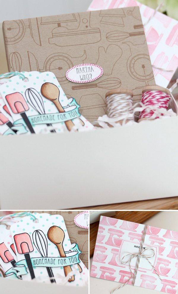 Inside my recipe box, I piled in this fun collection of kitchen themed goodies stamped with several sets from Clear and Simple Stamps Collection 7. I especially love this notebook! It’s completely handmade including a bookbinding technique that I’ll be teaching you very soon!