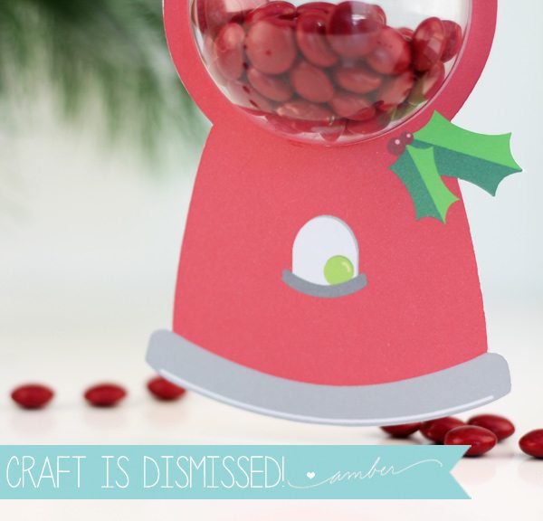 {1} Once you’ve printed and cut your gumball machine image, just slip one half of the ornament through the hole. The really nice thing about doing this on the Explore is that I was able to design the hole to be a perfect fit for the plastic ornament. This way, I can cut this same design again and again and it’ll fit everytime. If I did this by hand with a circle cutter or a craft knife, it would be tough to be this precise each time.