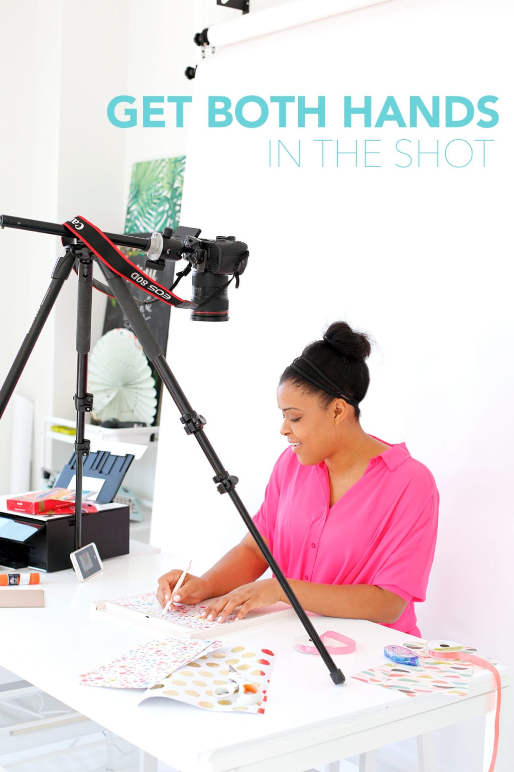 One of the more popular photography questions I get is: How do you get both hands in your tutorial photos? Well, friends – for a long time I didn’t. I did this weird, uncomfortable thing where I photographed with one hand while the other arm was held out extended as far as I possibly could. Here’s what it looked like. Not terrible, but there was definitely room for improvement. Now, I shoot with an overhead lateral arm and my phone as a remote. This lets me get both hands into the shot – let me show you exactly how it happens.