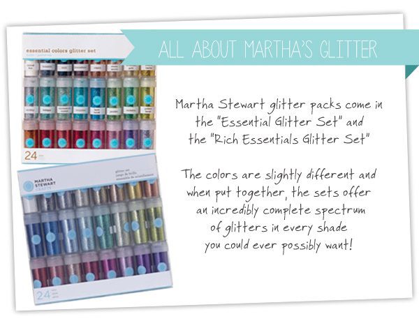 2) There are actually two 24-vial glitter sets offered by Martha Stewart. I’d previously thought that there was just one set, but when I took a closer look I realized that these two sets give you a whopping 48 color choices. That’s just bananas. The Essential Glitter Set offers basic colors that are bright and brilliant. The Rich Essentials Set includes colors that are a bit deeper and fill in any gaps in the Essential Glitter set.