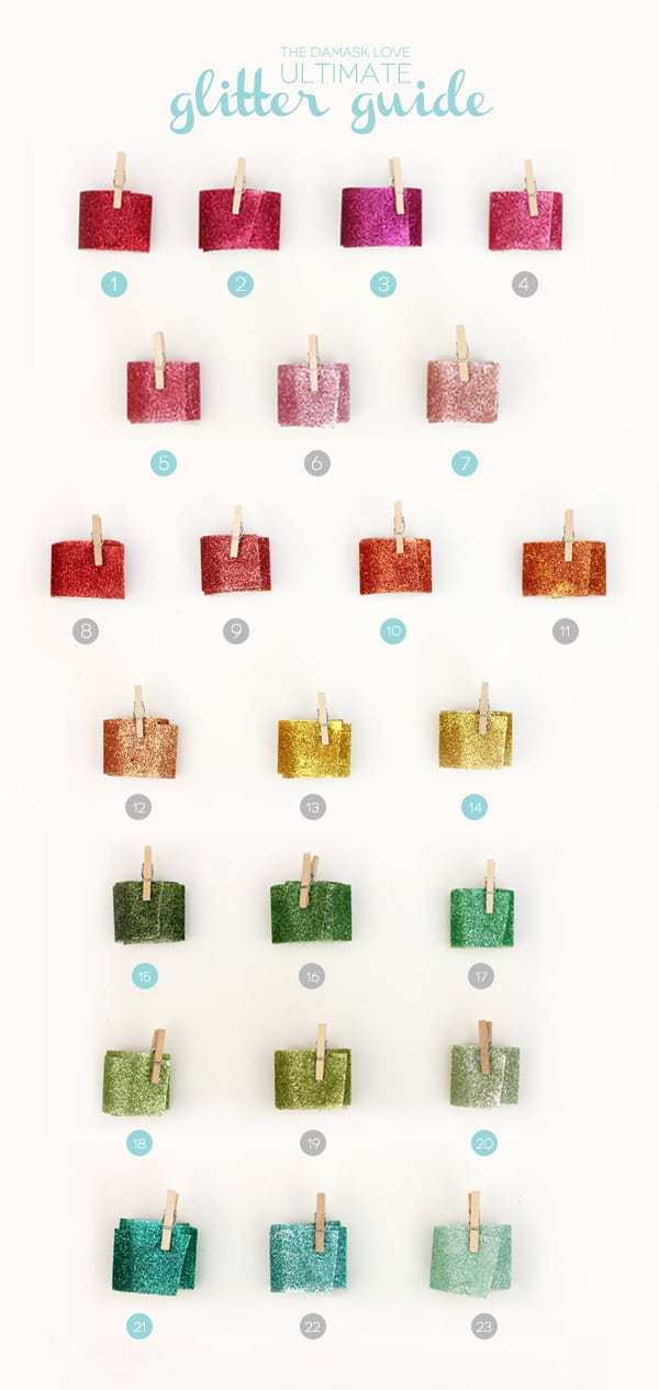 So, in honor of my glitter obsession I’m bringing you the Damask Love Ultimate Guide to Glitter… along with a quick tutorial on how you can put this prettiness to use.