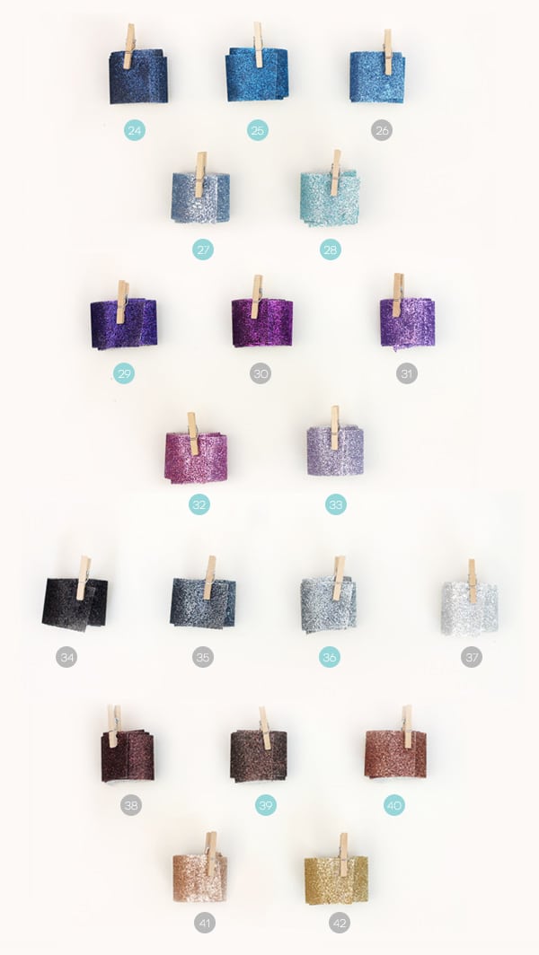 Note: Blue numbers indicate glitters from the Rich Essentials Set and Grey numbers indicate glitters from the Essential Glitter set.