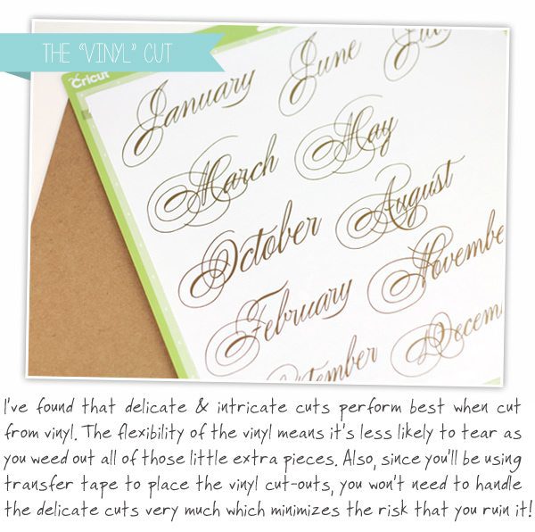{2} Month words cut from gold vinyl. This is the most labor intensive part of the project. Cricut Design Space allows you to use whatever fonts you already own on your computer, so I used one of my favorite script fonts to spell out the months of the year. I cut them from gold vinyl, which is a great medium for cutouts that are delicate and might otherwise rip or tear if cut from paper.
