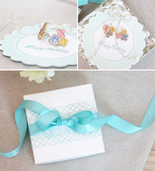 Yep! There’s more. I just had to share these stud earring and their yummy packaging. After making the earrings, I mounted them on a paper doily which I cut from the Doily Lace patterned paper pad. From there, I used my scoring board to create a gift box. Perfect birthday gift!