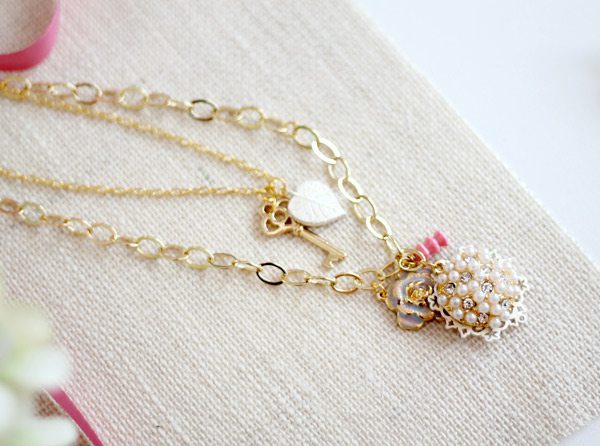 Last week, I posted THESE charm necklaces which are very easy to make. Today’s jewelry ensemble takes a totally different approach with a floral vintage feel. With all the charms in the Martha Stewart Jewelry line, it wasn’t too difficult to piece together a few of my favorites to create this look.