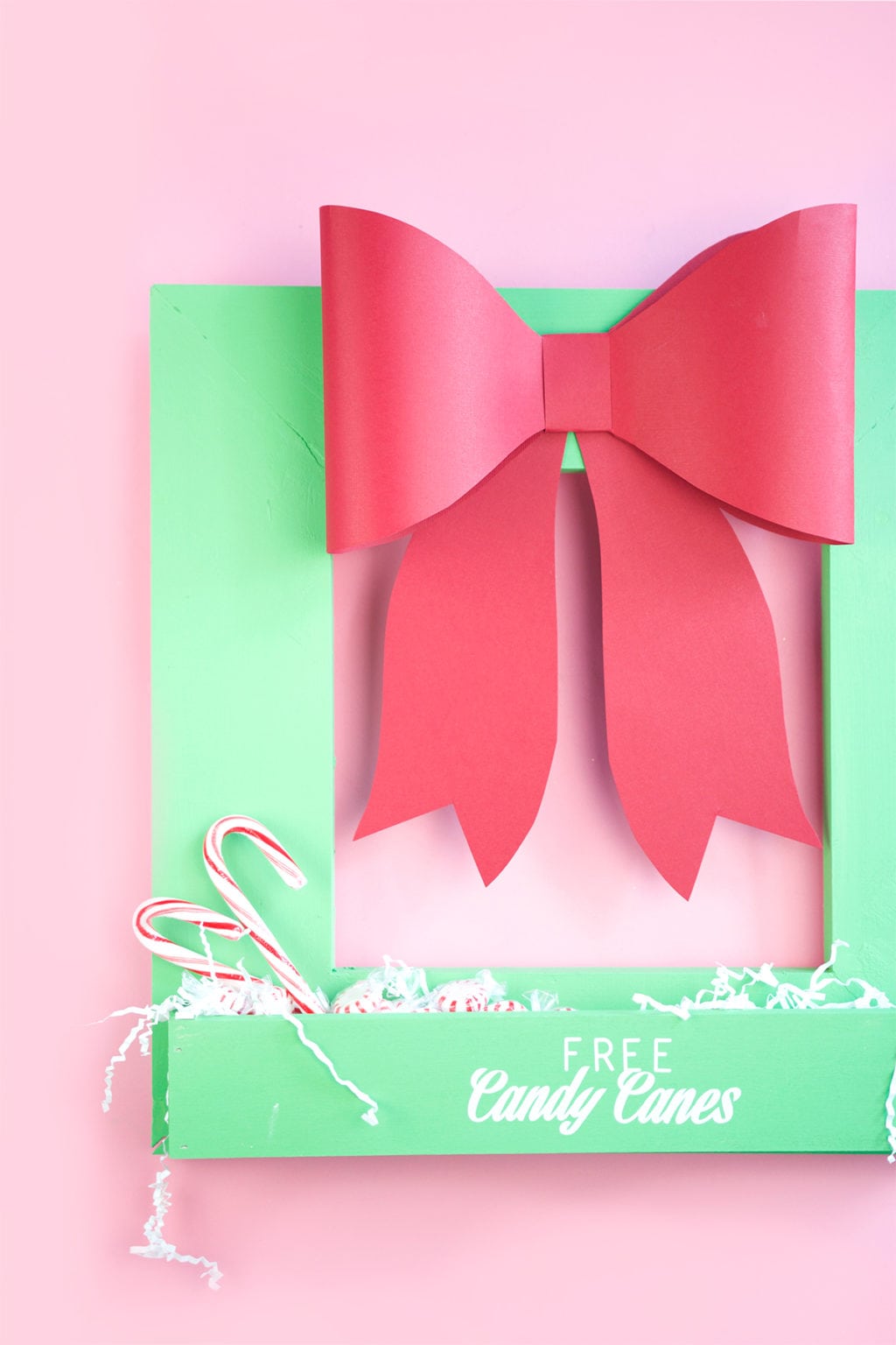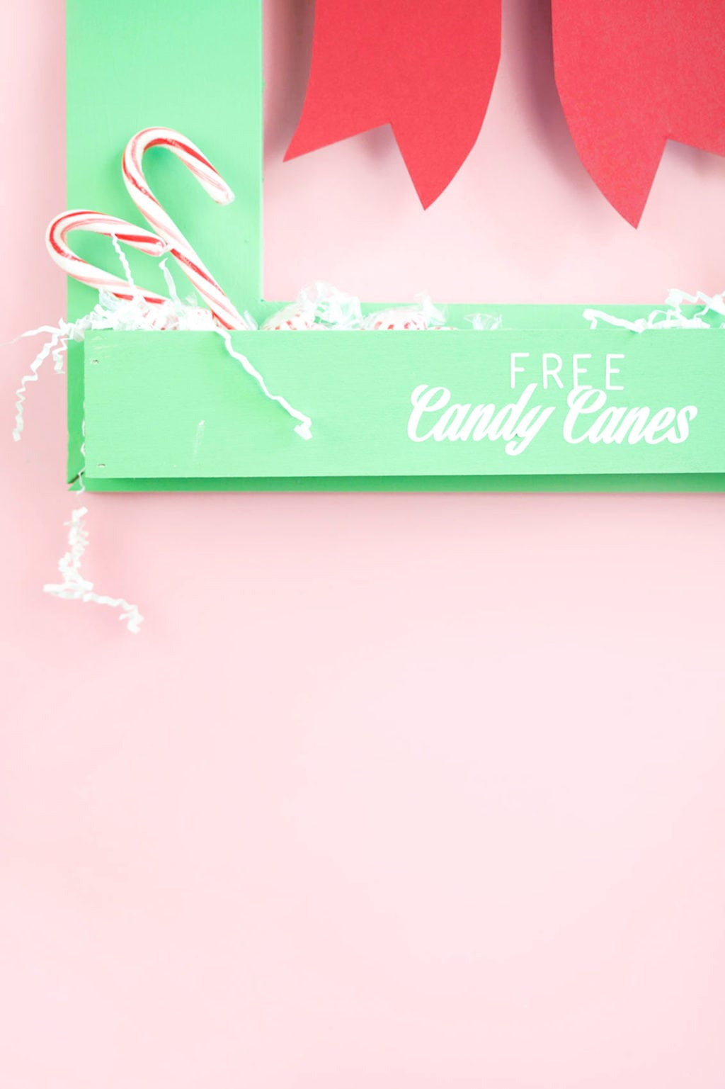 If you saw last quarter’s fence post candy holder, the design of this wreath will look very similar. It’s a simple wood frame painted and dressed up to look like a wreath …and filled up with those dreaded peppermint candy canes!